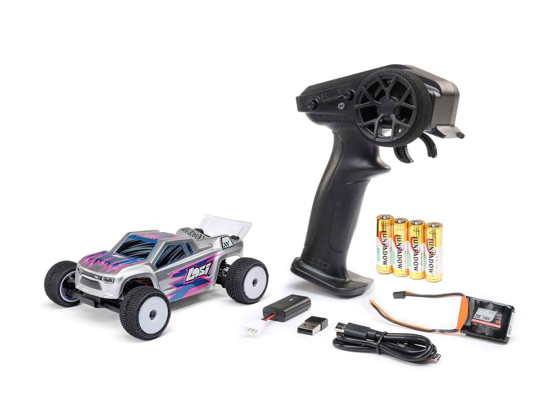 All of the accessories that come with the Micro-T are of better quality than what's normally included in ready-to-run packages. The Spektrum 350mAh LiPo battery supplies enough power for more than 25 minutes of nonstop run time, compared to the eight minutes typical of many RTR vehicles. Recharging takes less than an hour using the provided Spektrum .5A USB-C charger. Most standard RTR chargers require as much as 2-5 hours. Adding to the convenience, you can race the Losi Micro-T indoors or out - in your living room, on a paved driveway, or at a local park.